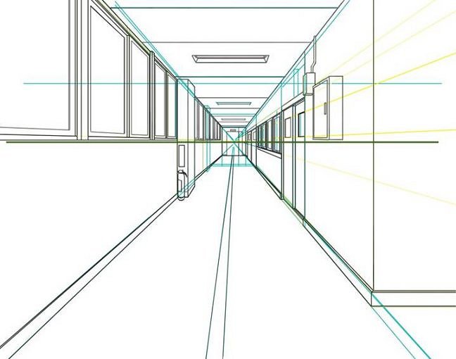 | えーと、消失点と交わるように、緑色の太線が追加されているのが分かるでしょうか? |