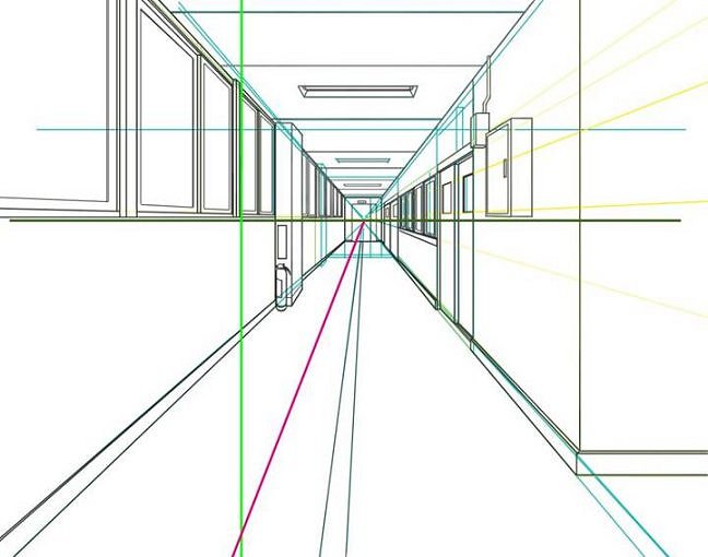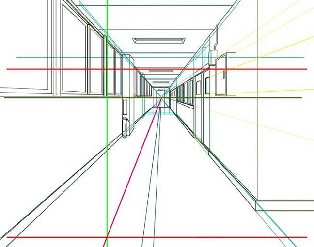 | 消失点から紫色の線が引かれ、それと交差する位置に垂直な薄緑色の線が引かれていますね。 |