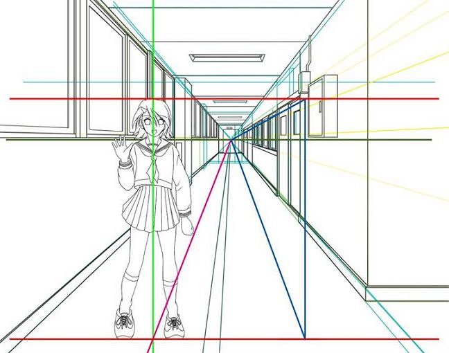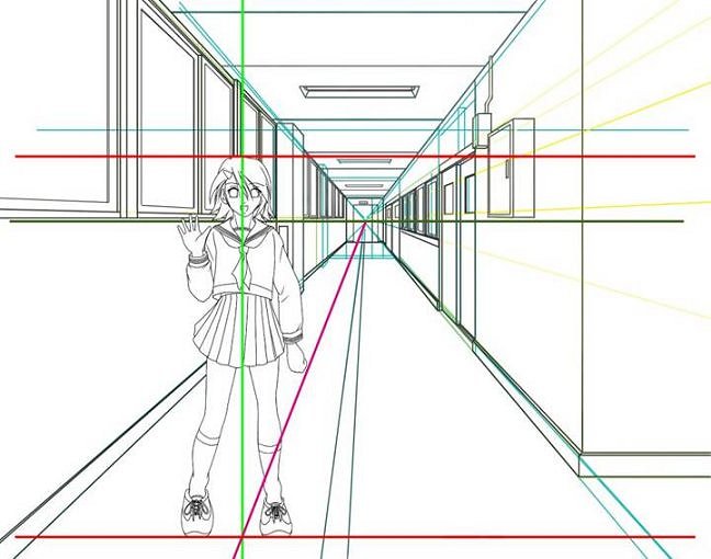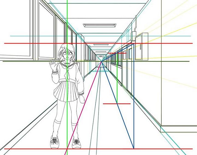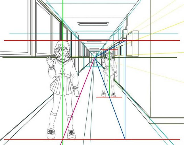 | キャラの身長に合わせた平行線に合わせて、消失点から青いラインを引きました。 |