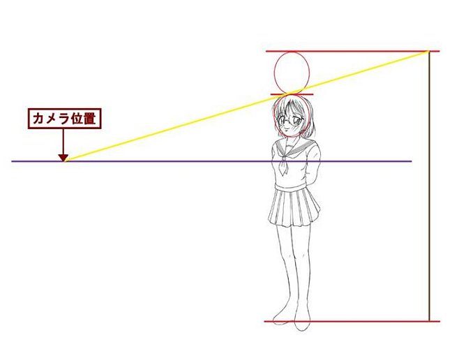 | キャラの胸元まで伸びている紫の線が、アイレベルです(二つ上の図説と見比べてみましょう) |