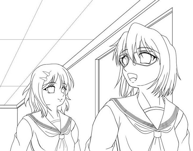 | 下書きの補助線と、キャラと重なる部分の線を消す(あるいはキャラとの間にレイヤーを追加し、白で塗り潰す)と、出来上がりです。 |
